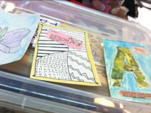 We've completed 5 weeks of art exploring...learning, making, sharing... Now what? Why not join an artists trading card group!? Fun! Yahoo and www.swap-bot.com both have groups of cReATiVe people just like you who want to stay inspired by swapping art. Just join a group and submit your work! Then open your mailbox and find worldly treasures awaiting you! I love them! Here are some snippets from our Tuesday night class to get you excited!